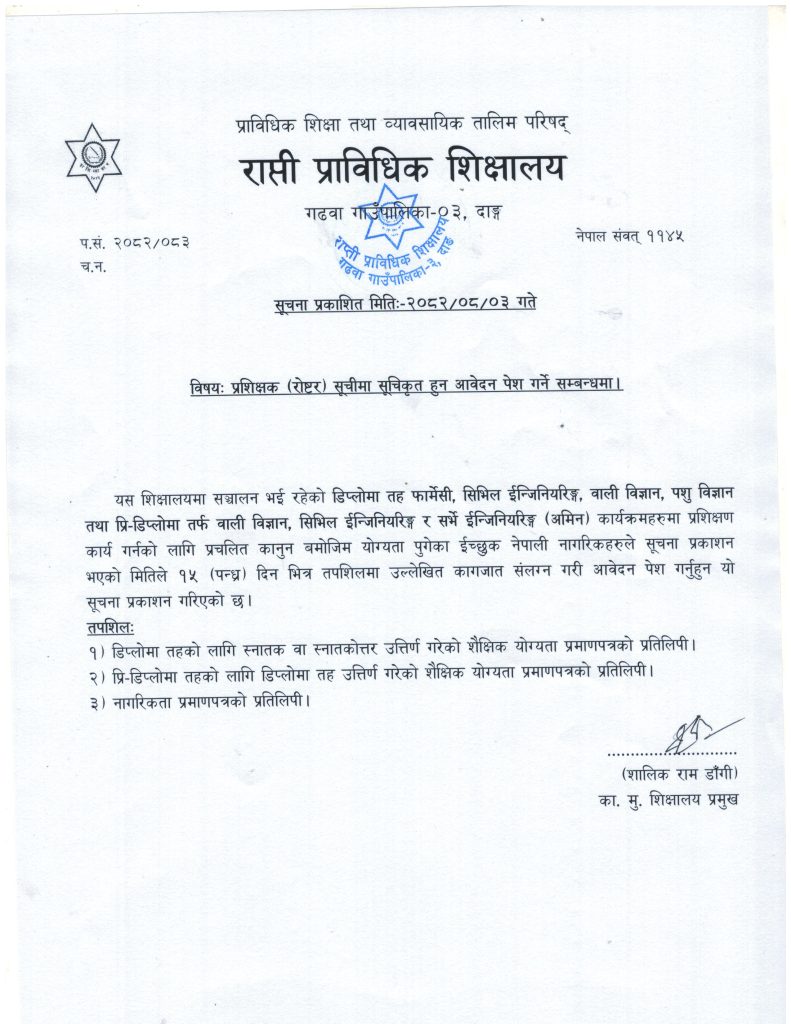 राप्ती प्राबिधिक शिक्षालय गढवा गाउपालिका-३ डिप्लोमा इन Pharmacy कार्यक्रम काे रिक्त सिट्मा निबेदन पेस गर्ने सम्बन्धी अत्यन्तै जरुरी सूचना 2082/05/18